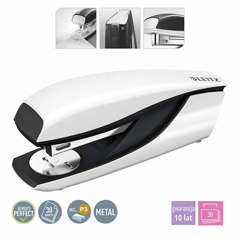 Ten dziurkacz wyposażony jest w opatentowane rozwiązanie – wgłębienie w tylnej części podstawy, które jest zgodne z rozstawem ringów w segregatorze. Umożliwia to szybkie dziurkowanie bez konieczności używania listwy formatowej, co znacząco przyspiesza pracę. Pojemnik na ścinki jest łatwy do opróżnienia, co zapewnia czystość i porządek na Twoim biurku, a ergonomiczna dźwignia z blokadą ułatwia przechowywanie.
