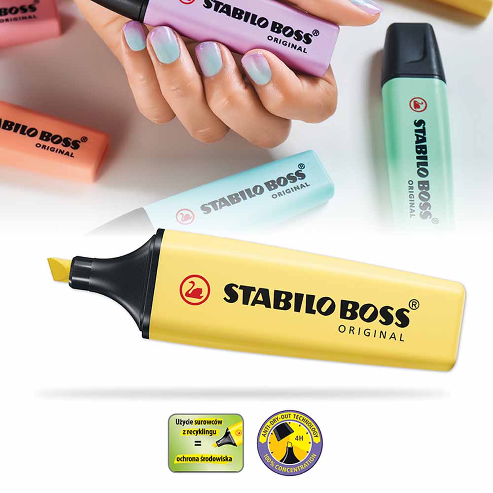 STABILO BOSS ORIGINAL dba o środowisko - wszystkie czarne elementy zakreślaczy wykonane są z plastiku pochodzącego z recyklingu. Zakreślacze są również łatwe do ponownego napełnienia, co redukuje ilość odpadów.