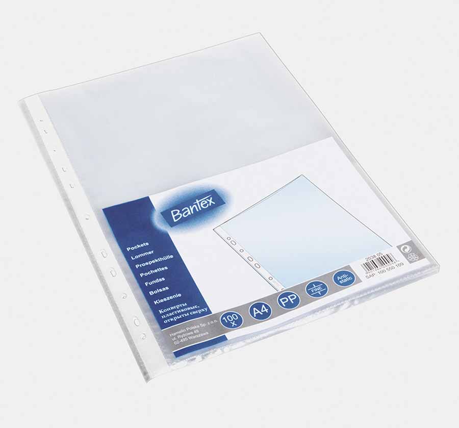 wykonane z miękkiej, gładkiej folii polipropylenowej o grubości 75μm posiada właściwości antyrefleksyjne krystaliczne, transparentne wzmocniony brzeg rozcięte na górze antyelektrostatyczne odpowiednie do dokumentów w formacie A4 ilość dziurek do wpięcia: 11 rozmiar: 228x305mm 100 sztuk w j.s. wyprodukowane w fabryce posiadającej certyfikat kontroli jakości GB/T 19001-2016/ISO 9001:2015 kolor transparentny