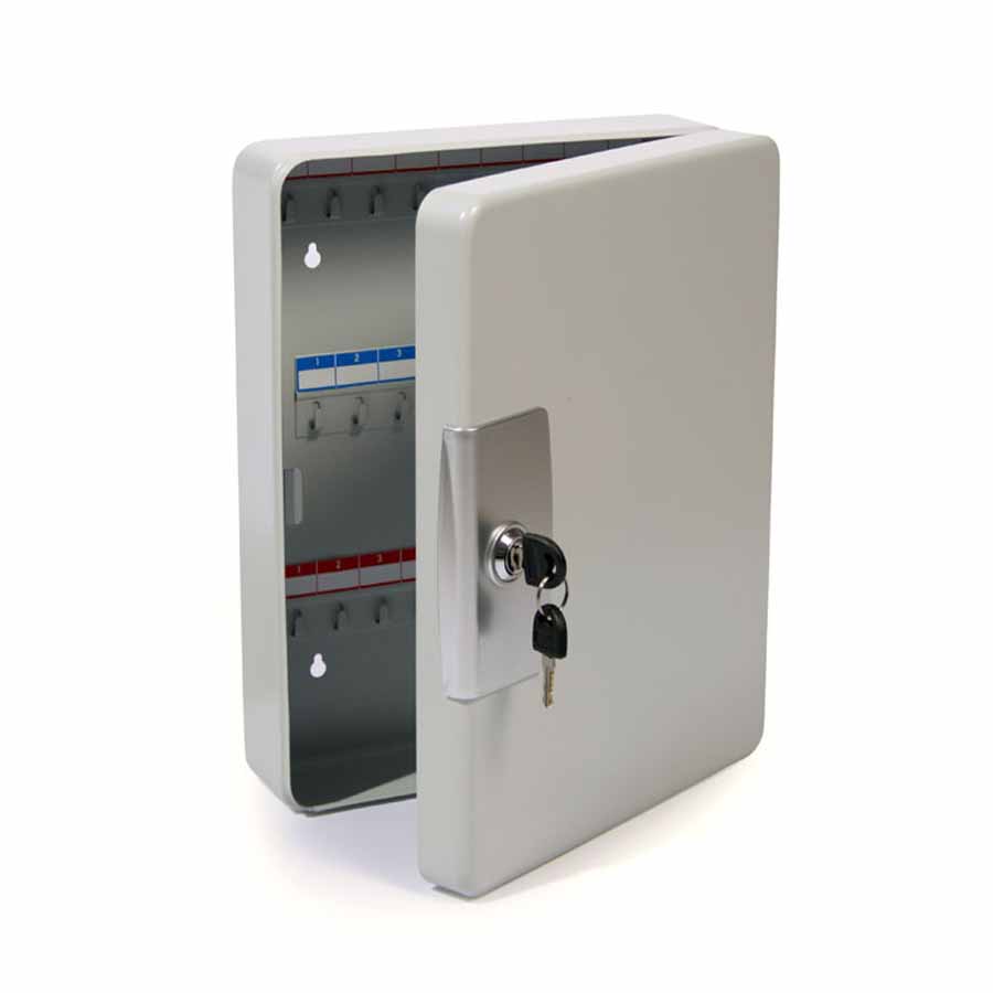 - metalowa - szary kolor - zamykana na klucz - w komplecie z kolorowymi zawieszkami na klucze