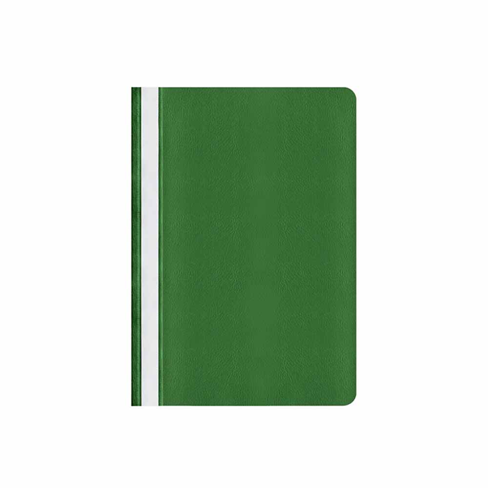 Skoroszyt wyposażony jest w wymienny, papierowy pasek do opisu, który ułatwia identyfikację zawartości. Dwa wycięcia umożliwiają szybkie i łatwe wysuwanie paska, co dodatkowo poprawia funkcjonalność. Zaokrąglone rogi obu okładek zwiększają komfort użytkowania i zapobiegają uszkodzeniom innych dokumentów.