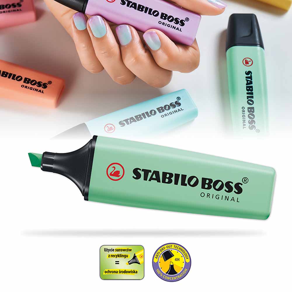 STABILO BOSS ORIGINAL dba o środowisko - wszystkie czarne elementy zakreślacza wykonane są z plastiku pochodzącego z recyklingu. Zakreślacz jest również łatwy do ponownego napełnienia, co redukuje ilość odpadów.