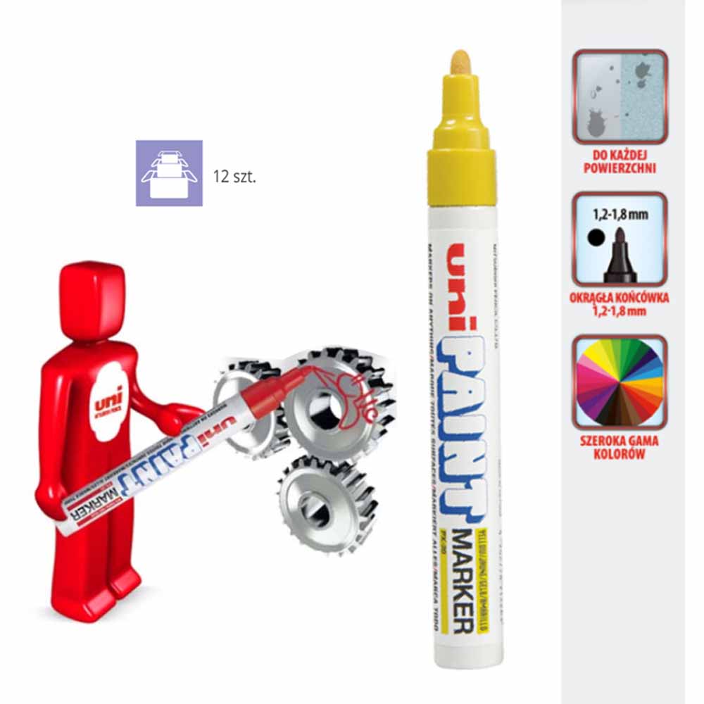Marker olejowy UNI PX-21, w kolorze żółtym, to niezastąpione narzędzie do znakowania wszelkiego rodzaju powierzchni: szorstkich, gładkich i tłustych. Bez względu na to, czy pracujesz z metalem, szkłem, kamieniem, plastikiem, styropianem czy drewnem, UNI PX-21 zapewnia wyraziste i trwałe oznaczenia.