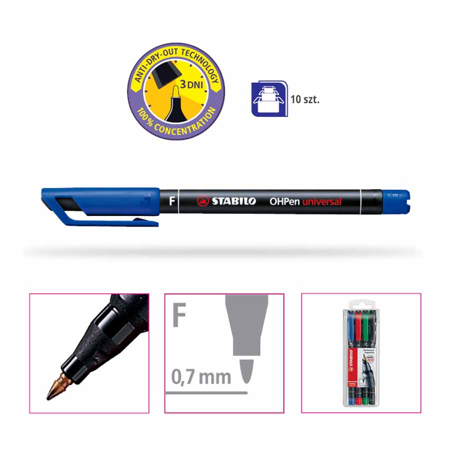 Foliopis STABILO OHPen M jest niezwykle wszechstronny, idealny do pisania na szkle, torebkach foliowych, etykietach, zdjęciach, błyszczącym papierze, płytach CD oraz zdjęciach rentgenowskich. Jego uniwersalność sprawia, że jest niezastąpiony w wielu sytuacjach.
