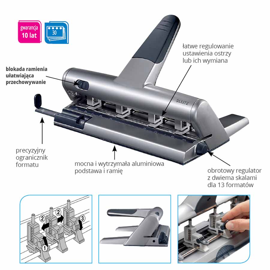 Eagle 837 umożliwia dziurkowanie do 25 kartek jednocześnie przy stałym rozstawie otworów wynoszącym 80 mm. Średnica dziurki 5,5 mm jest idealna do większości segregatorów, co czyni ten dziurkacz niezastąpionym narzędziem w każdym biurze. Produkt objęty jest 3-letnią gwarancją, zapewniając wysoką jakość i trwałość.