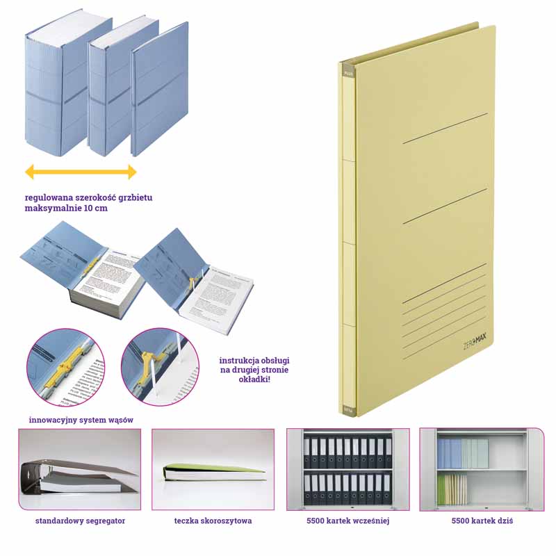 - szerokość teczki zwiększa się wraz z ilością przechowywanych dokumentów, efektem jest znaczna oszczędność przestrzeni