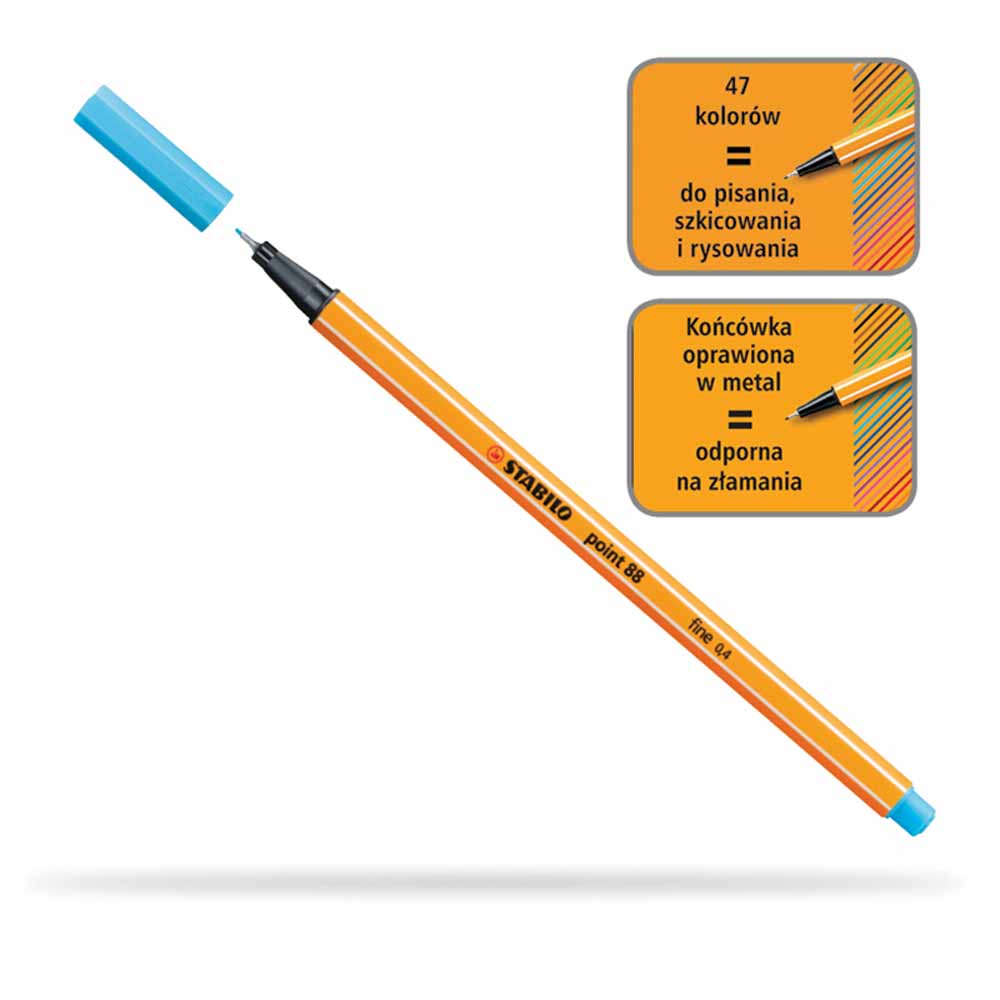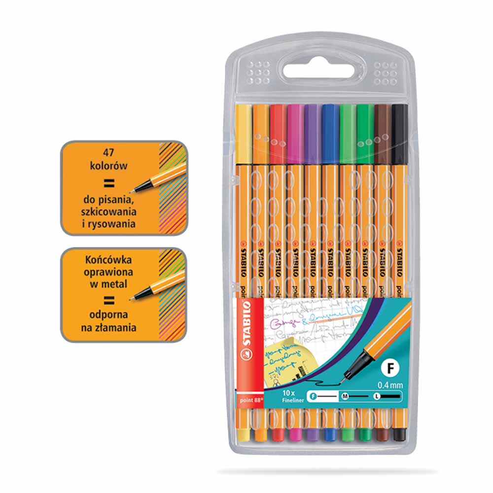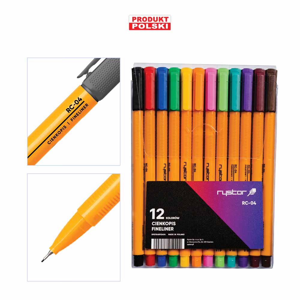 fibrowa końcówka oprawiona w metal, odporna na rozwarstwianie się obudowa w kolorze tuszu o heksagonalnym kształcie i paskami w wzdłuż obudowy, w kolorach obudowy: czerwonym, niebieskim, zielonym- pasek koloru czarnego, w czarnym kolorze obudowy pasek koloru szarego wentylowana skuwka w kolorze tuszu o heksagonalnym zakończeniu tusz na bazie wody, odporny na wysychanie bezzapachowy nietoksyczny długość linii pisania: 500-600m linia pisania: 0,4mm końcówka: 0,4mm na każdym cienkopisie nazwa modelu D-fine, marki Donau oraz grubość 0,4mm idealny do tworzenia kolorowych notatek, pracy z szablonem itp. do użytku w biurze, szkole oraz w domu obudowa wykonana z PP ISO 9001 opakowanie: 4 kolory kolor: mix kolorów