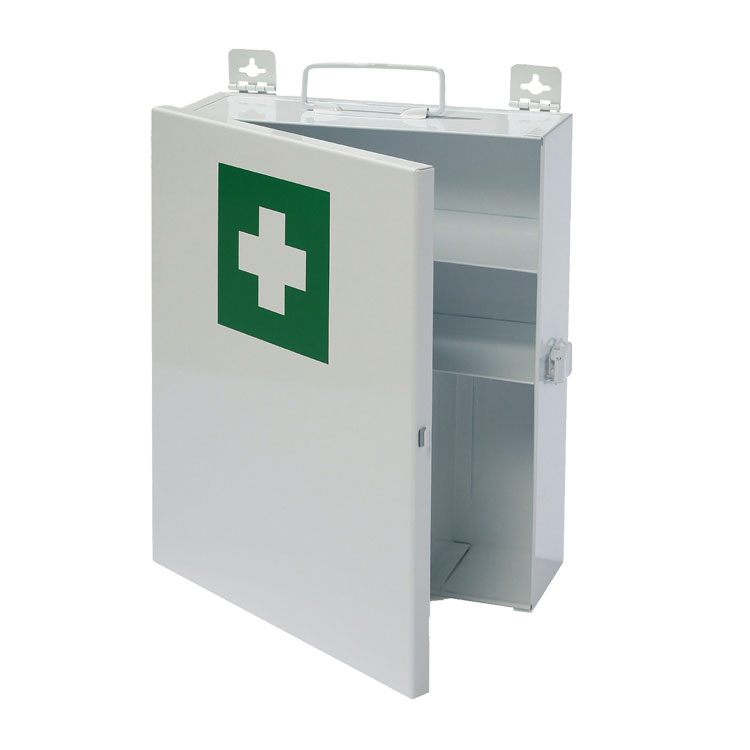 naścienna apteczka przeznaczona do zakładów pracy szafka metalowa wykonana z blachy stalowej malowanej farbą proszkową zamykana na klucz uchwyty do zamocowania na ścianie wyroby medyczne oznakowane znakiem CE apteczka spełnia wymagania norm Unii Europejskiej termin ważności produktów sterylnych wynosi 5 lat wyposażenie: DIN 13164 + aparat do sztucznego oddychania zawiera: - plaster na szpulce 5m x 2,5cm – 1 szt. - zestaw plastrów - 14 szt. - bandaż elastyczny 4m x 6cm – 2 szt. - bandaż elastyczny 4m x 8cm – 3 szt. - rękawice winylowe - 4 szt. (2 pary) - chusta opatrunkowa 60cm x 80cm – 1 szt. - bandaż z kompresem (opatrunek indywidualny) 6cm x 8cm– 1 szt. - bandaż z kompresem (opatrunek indywidualny) 8cm x 10cm – 2 szt. - bandaż z kompresem (opatrunek indywidualny) 10cm x 12cm – 1 szt. - kompres na rany 10cm x 10cm – 6 szt./3 opak. - chusta trójkątna 96cm x 96cm x 136cm - 1szt. - koc termiczny (ratunkowy) – 1 szt. - nożyczki – 1 szt. - chusteczki nasączone – 2 szt. - maska medyczna – 2 szt. - instrukcja udzielania pierwszej pomocy – 1 szt. - aparat do sztucznego oddychania wymiary: 240 mm x 220 mm x 120 mm kolor: biały