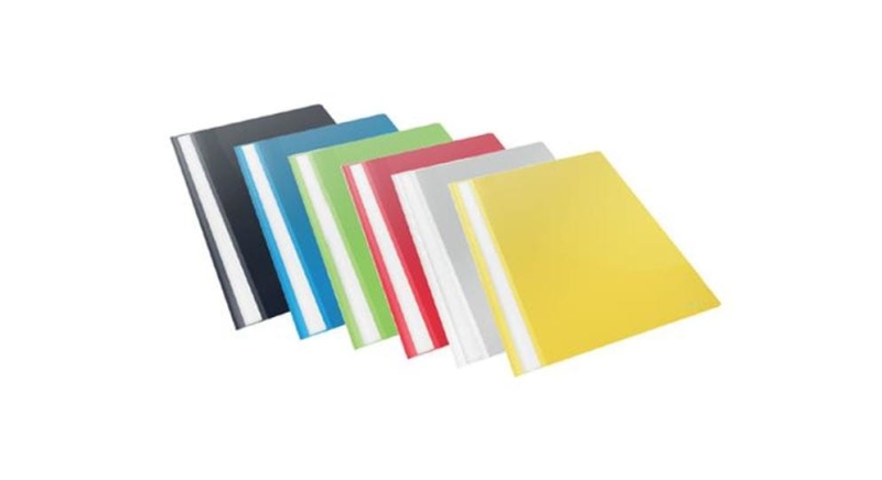 Skoroszyt wyposażony jest w wymienny, papierowy pasek do opisu, który ułatwia identyfikację zawartości. Dwa wycięcia umożliwiają szybkie i łatwe wysuwanie paska, co dodatkowo poprawia funkcjonalność. Zaokrąglone rogi obu okładek zwiększają komfort użytkowania i zapobiegają uszkodzeniom innych dokumentów.